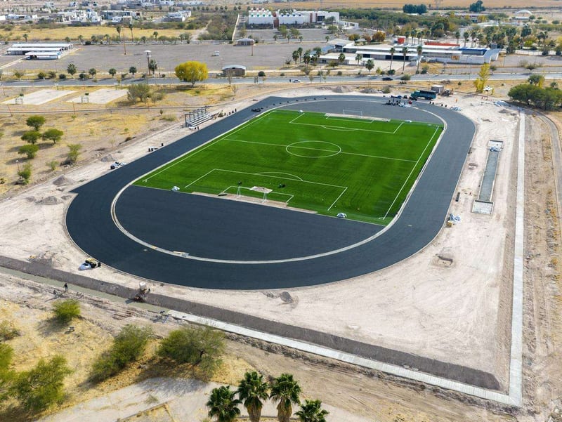 Completan pista y cancha de fútbol en Delicias; avanzan con cerco de protección
